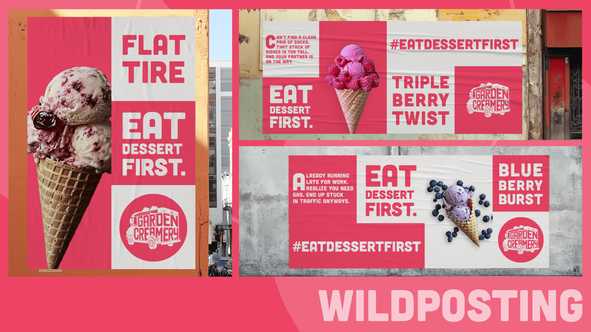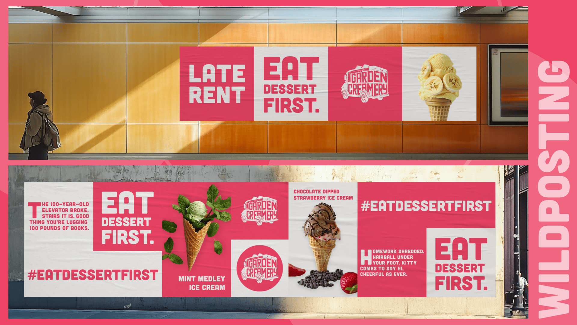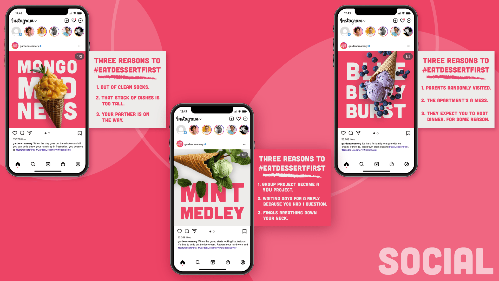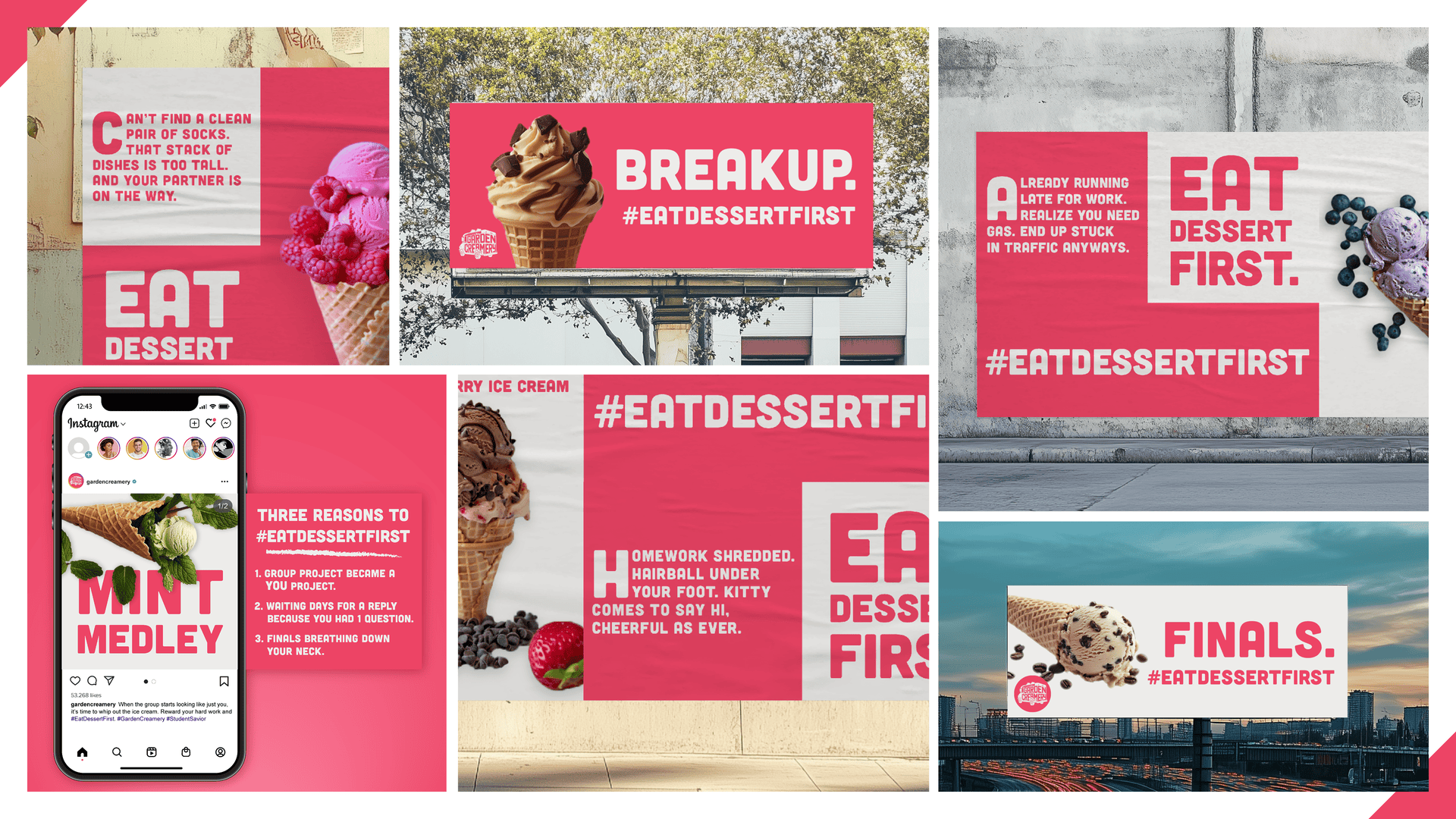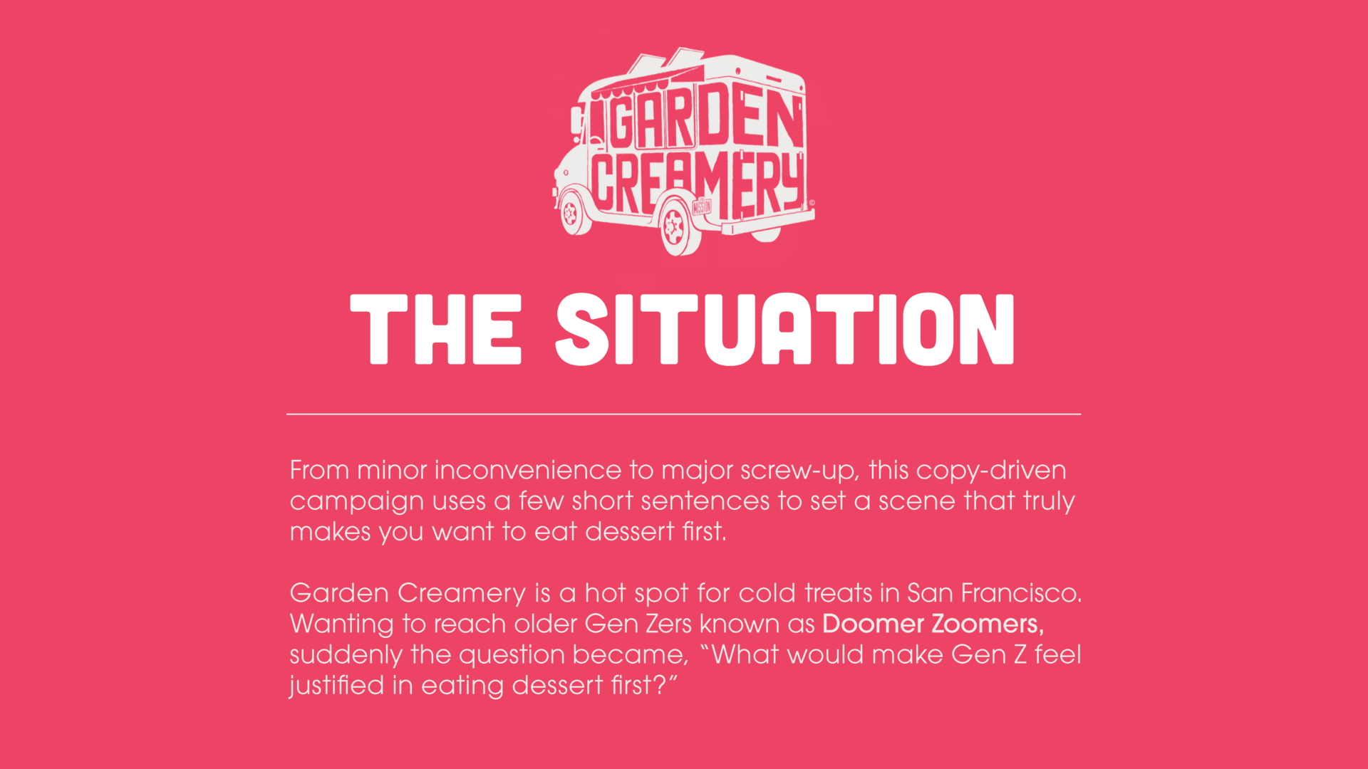 Garden Creamery is a hot spot for cold treats in San Francisco. Their pink aesthetic, photogenic treats, and Instagram posts have a stranglehold on Millennials. But, they have a massive Gen Z blindspot. Most ice cream advertising is very happy and cheerful—not what Gen Z "Doomer Zoomers" are currently feeling from the world. From there, the question that fueled the writing became, "What would make Gen Z feel justified in eating dessert first?"